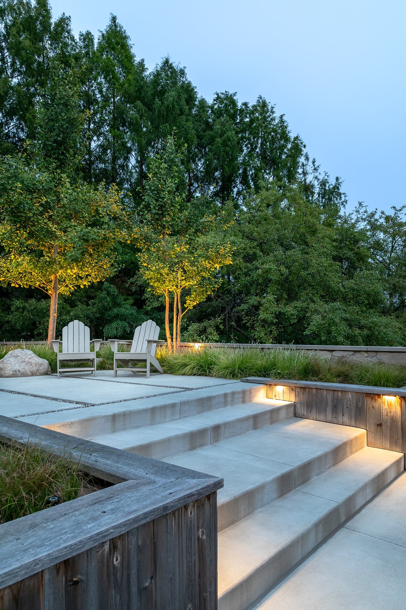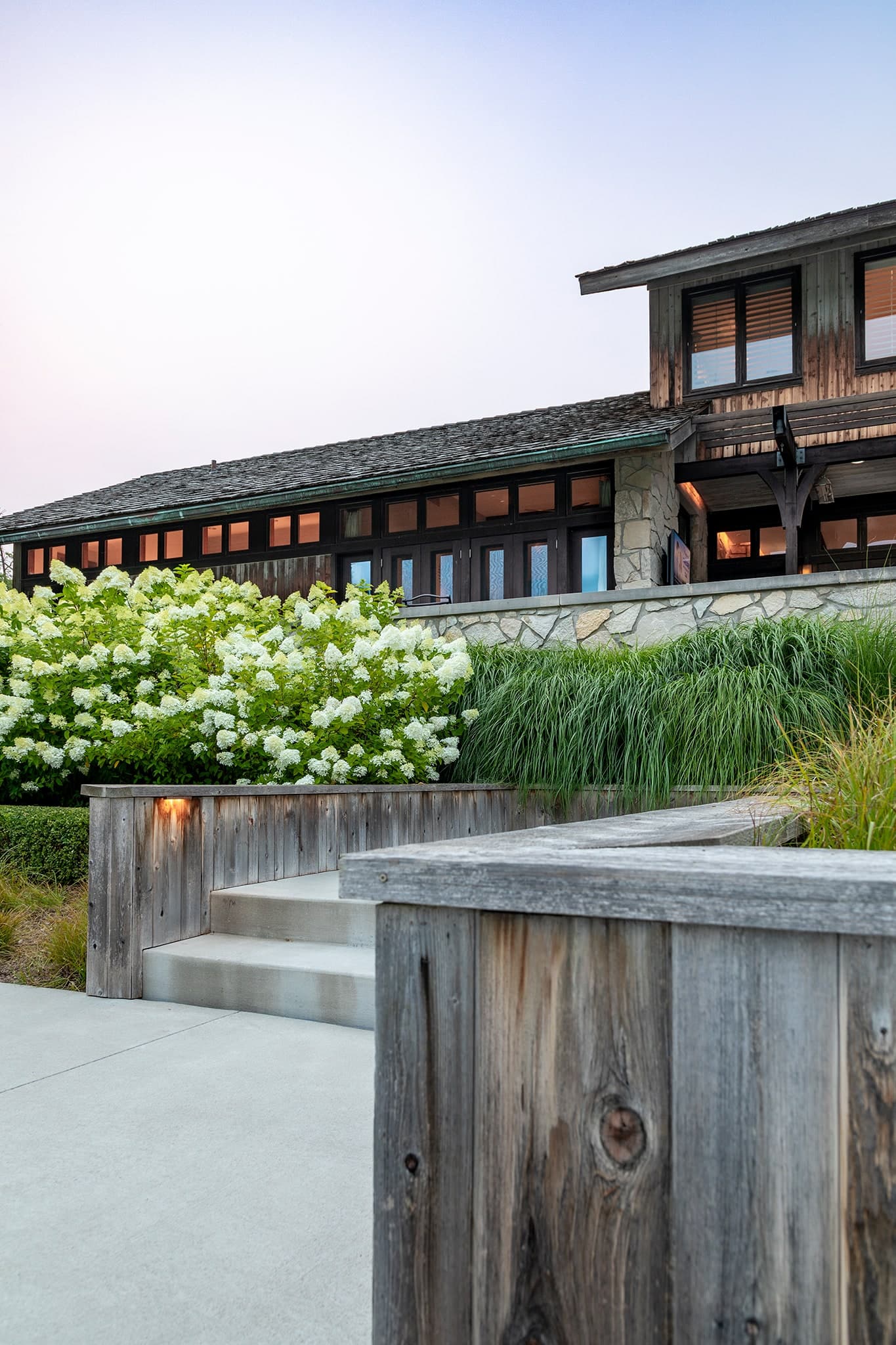 Areas for relaxation pepper the terrace including a fire table conversation space and private lounges. Taking inspiration from the house, the materials are simple and authentic. Planting beds bordered with weathered cedar echo the house’s façade, and a glass rail subtly protects the pool without impacting dramatic views of the lake beyond.