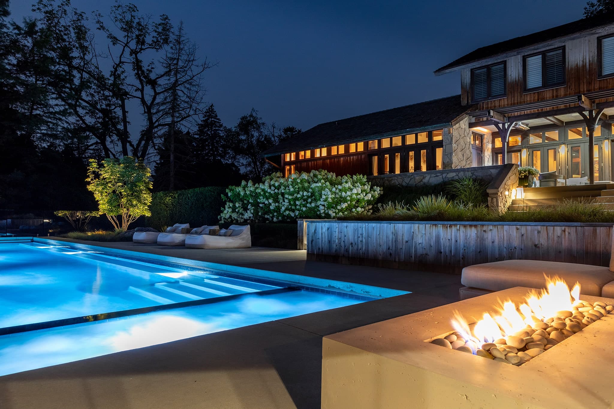 Natural stone outcroppings integrate with the landscape to echo the natural textures and character of the surrounding woods and architectural veneer. The smooth concrete deck cantilevers the pool beam forming a seamless coping adding a sense of lightness and delicacy to the space. In the pool and spa, carefully selected tile finishes with complementary blue hues create a cool, cohesive look.