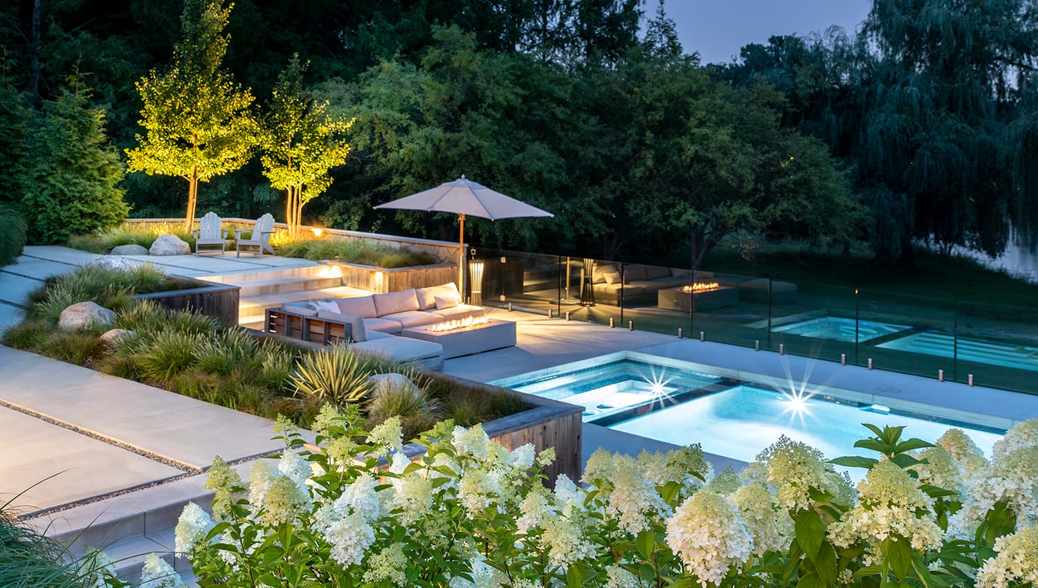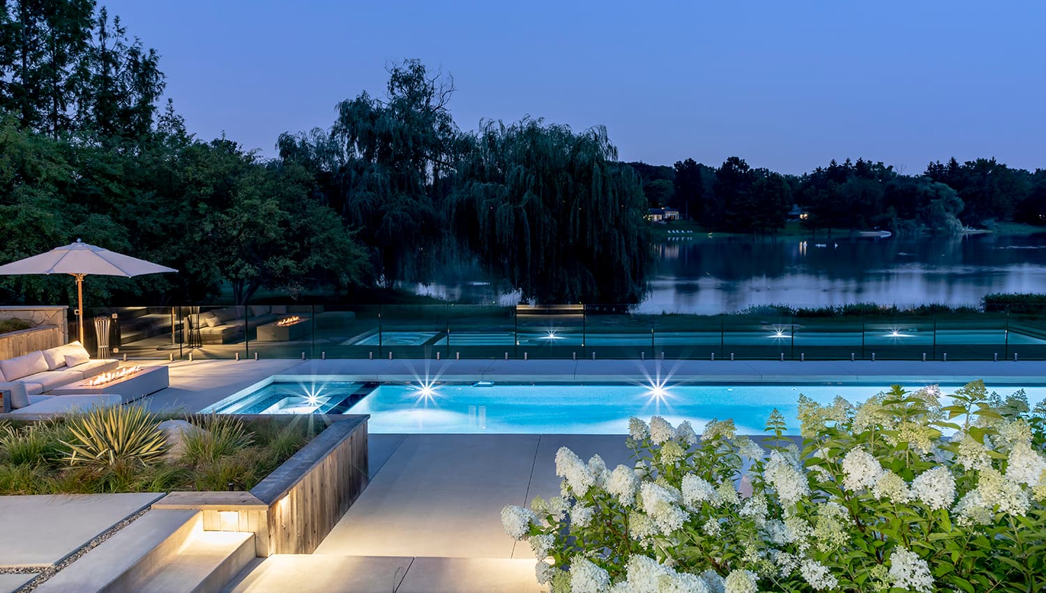 This 2021 project in Bloomfield Township grows organically from the existing house and incorporates a new stepped lakeside pool terrace perfect for outdoor living. The long narrow pool is oriented parallel to the main axis of the house, and the disciplined orthogonal lines of the hardscape follow suit, spatially anchoring landscape to architecture. Clean-cut stepper pathways with green joints allow access to all garden spaces while concrete steps slip between oversize planting beds and traverse the steep transition in grade. At the lowest level, the intimate pool terrace sits comfortably nestled between house and lake. An array of plantings of varying scales ensure that the garden can be enjoyed up close but also when viewing from afar.