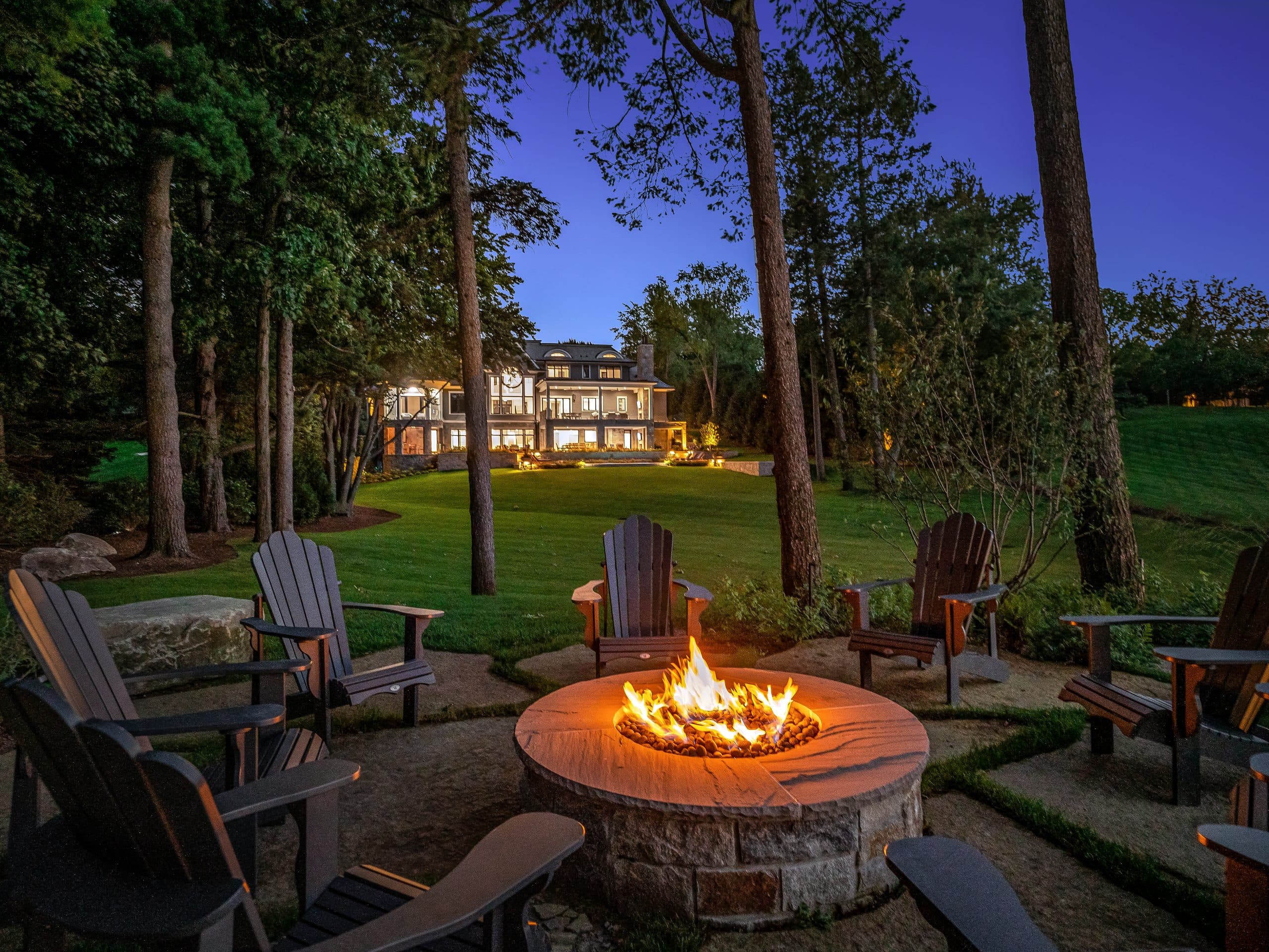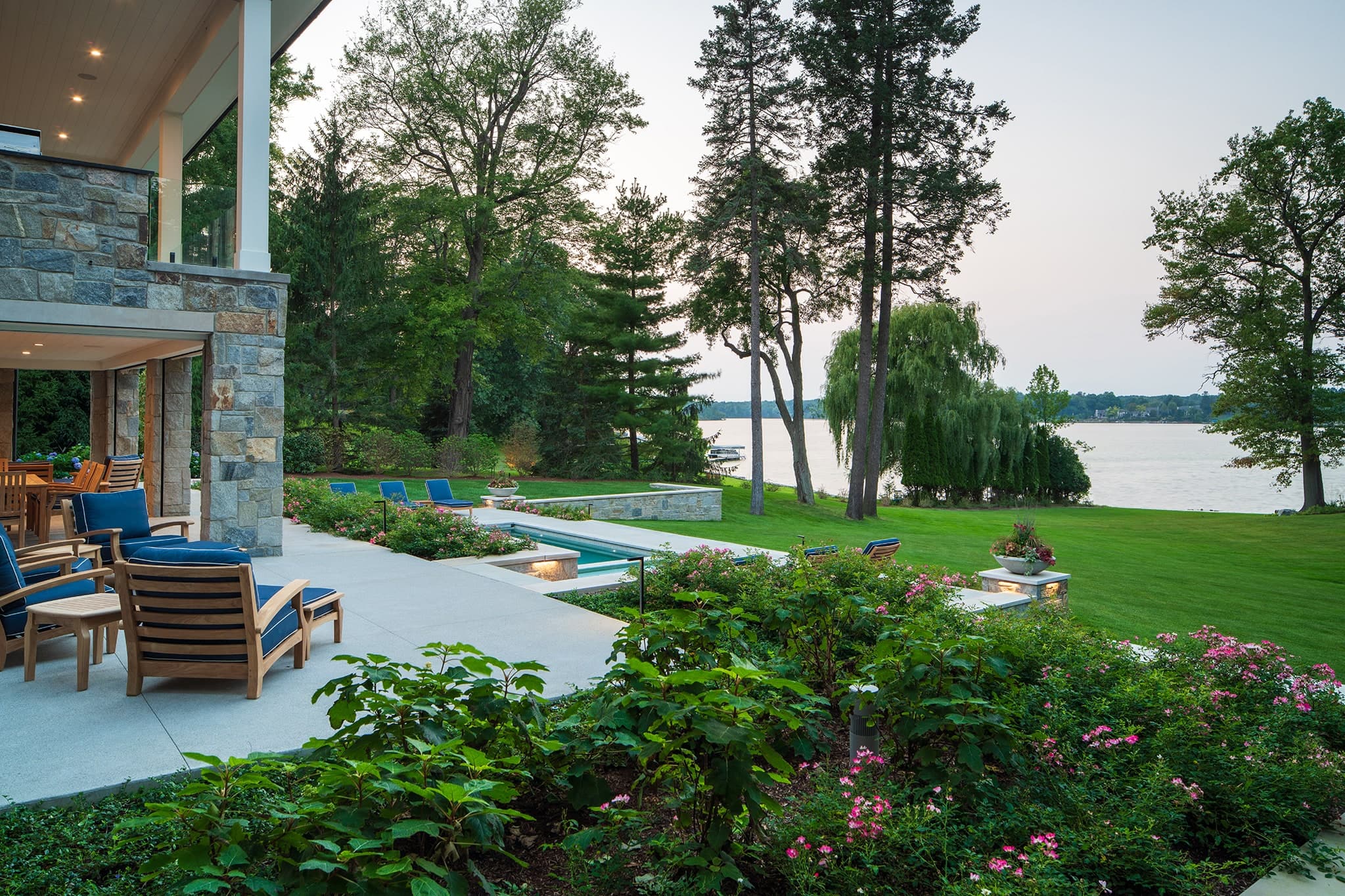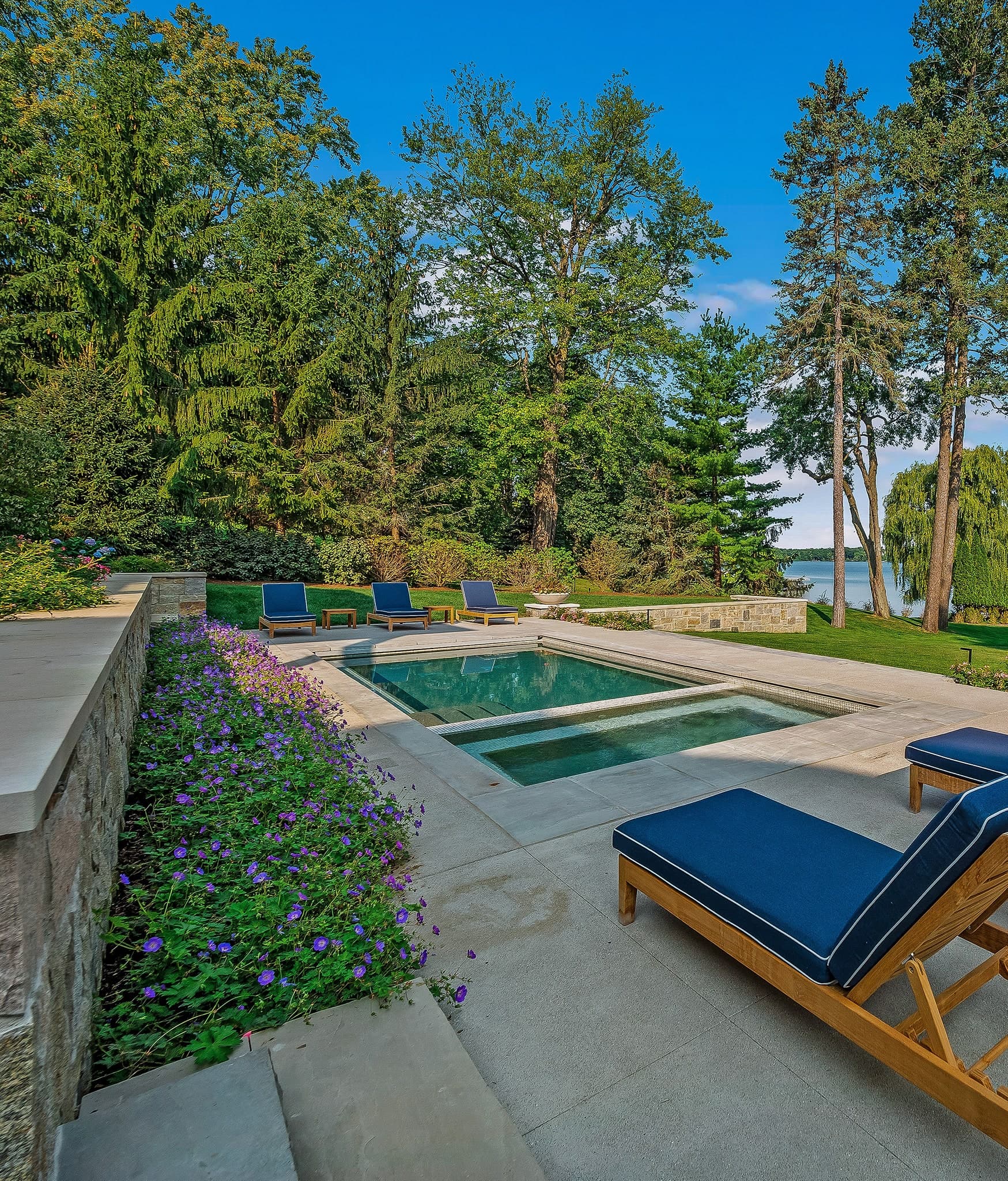 This 2022 project further enhances a rolling lake estate on Lake Angelus featuring a New Nantucket-style home. With its storybook feel, this property demanded a landscape that could support and highlight its unique character without being overdone. Careful consideration was given to maximize views of the lake, maintain privacy from neighbors, and preserve stands of mature trees. Consistent use of Connecticut stone in walls, columns, and other details extends the architecture into the garden and ensures a cohesive feel. Layers of plantings soften the hardscape and integrate the house into the land. A pair of stone piers welcomes guests, and a meandering drive allows time to appreciate the stunning façade. The curved wall is a nod to the classic architectural lines. In the back, the landscape steps from the house towards the lake via a series of terraces. All walls are kept orthogonal to maintain the formal language of the rear façade. The upper terrace is spacious, versatile, and features ample room for entertainment. The lower terrace integrates comfortably into the lawn’s gentle slope and features a plunge pool with a built-in spa. Significant design consideration was put into the pool’s structural components including extensive helical piers, grade beam footings, poured walls, and drainage systems resulting in beautiful finished work. By the lake, a firepit terrace and lake house offer a private waterside retreat surrounded by more casual plantings.