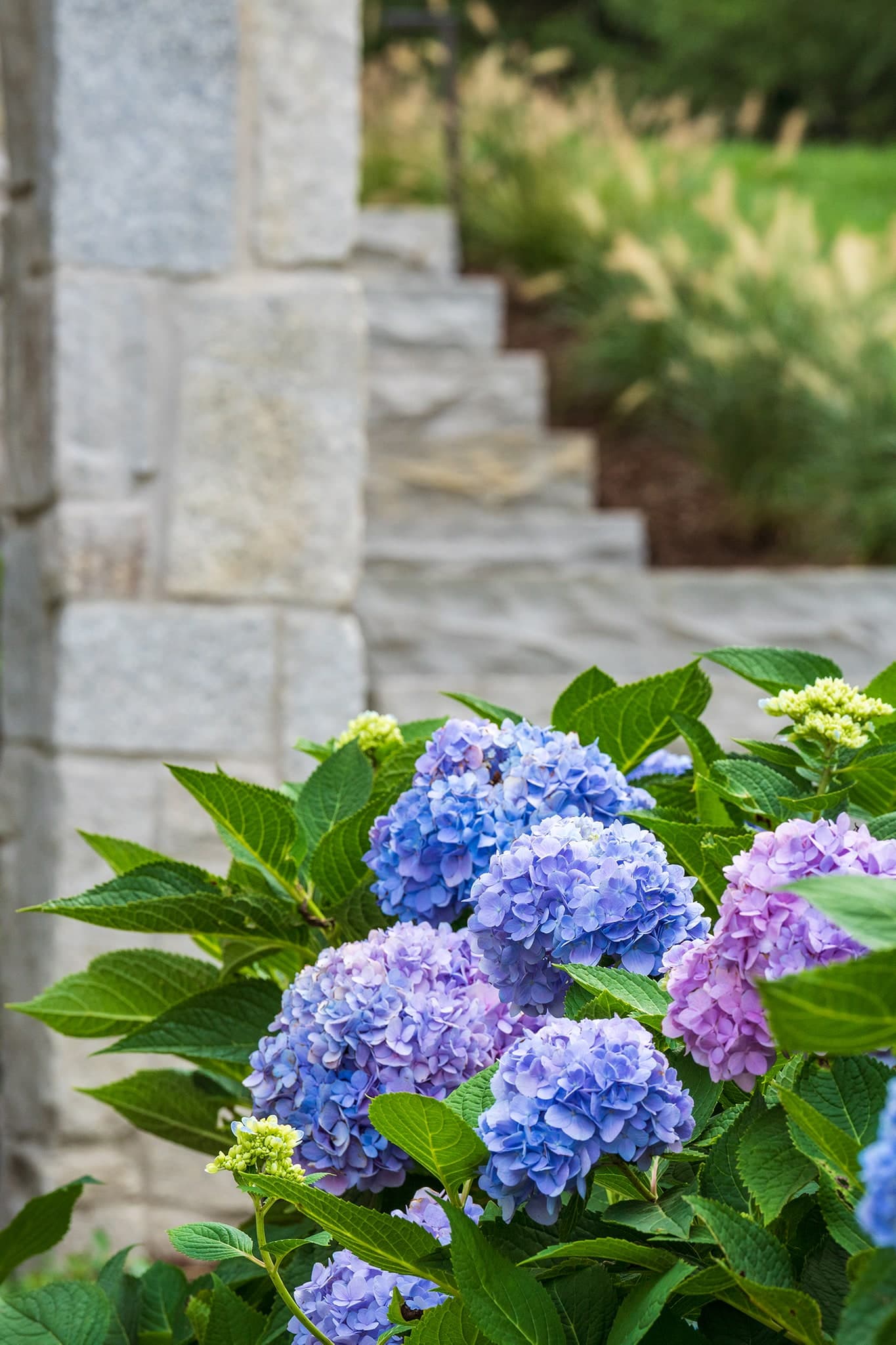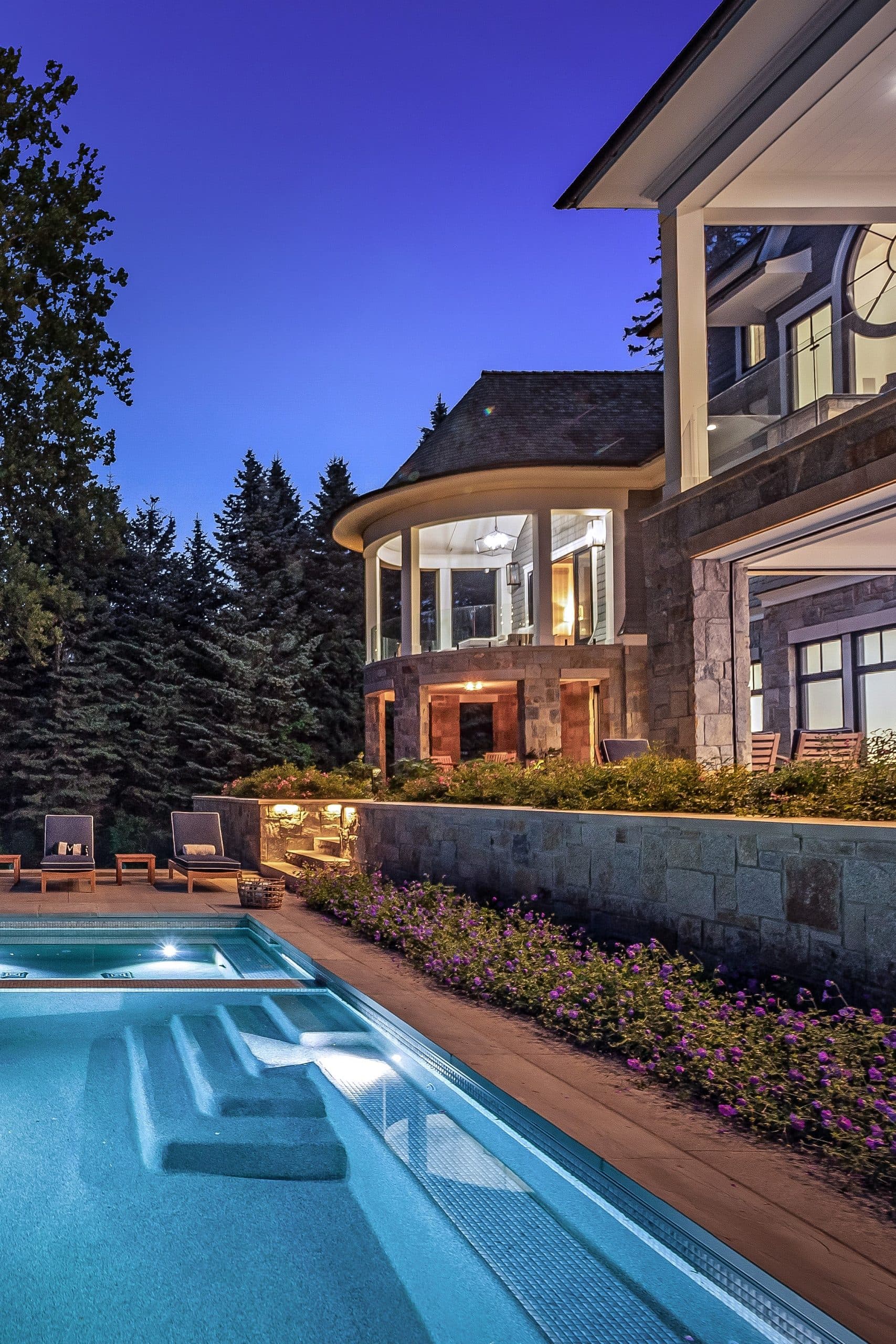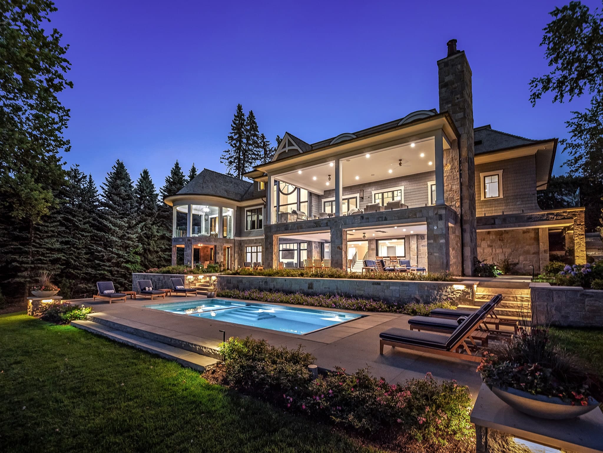 This 2022 project further enhances a rolling lake estate on Lake Angelus featuring a New Nantucket-style home. With its storybook feel, this property demanded a landscape that could support and highlight its unique character without being overdone. Careful consideration was given to maximize views of the lake, maintain privacy from neighbors, and preserve stands of mature trees. Consistent use of Connecticut stone in walls, columns, and other details extends the architecture into the garden and ensures a cohesive feel. Layers of plantings soften the hardscape and integrate the house into the land. A pair of stone piers welcomes guests, and a meandering drive allows time to appreciate the stunning façade. The curved wall is a nod to the classic architectural lines. In the back, the landscape steps from the house towards the lake via a series of terraces. All walls are kept orthogonal to maintain the formal language of the rear façade. The upper terrace is spacious, versatile, and features ample room for entertainment. The lower terrace integrates comfortably into the lawn’s gentle slope and features a plunge pool with a built-in spa. Significant design consideration was put into the pool’s structural components including extensive helical piers, grade beam footings, poured walls, and drainage systems resulting in beautiful finished work. By the lake, a firepit terrace and lake house offer a private waterside retreat surrounded by more casual plantings.