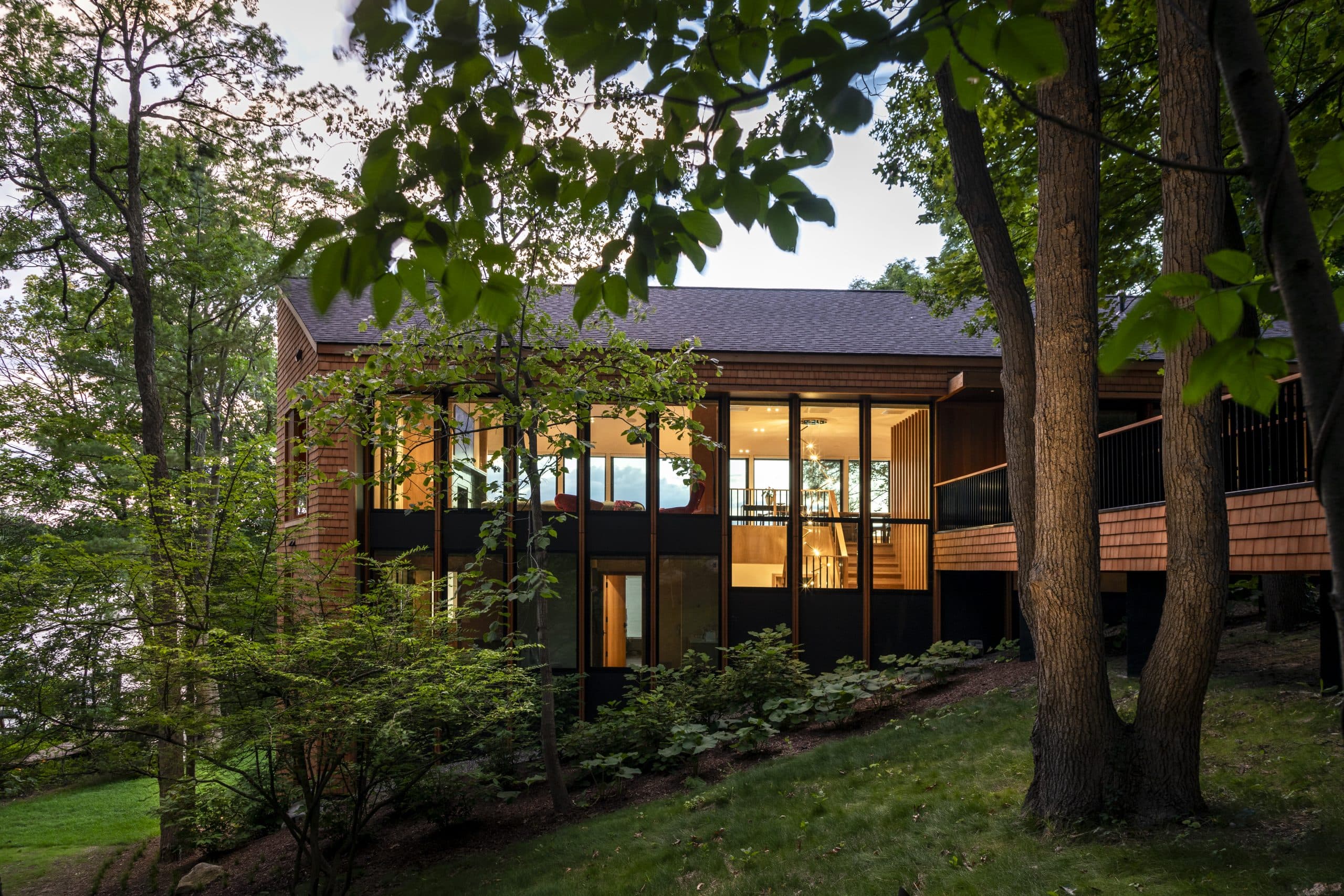 A carefully designed bridge leads guests through the woodland, preserving mature trees while introducing a tapestry of native woodland plants to rejuvenate the forest floor. A mix of native grasses, perennials, trees, and forbs enhances the sensory experience along the path to the home. To enhance the evening ambiance, landscape lighting has been strategically placed to highlight the garden paths and celebrate the majestic trees, creating a welcoming atmosphere for both residents and visitors. Overall, this renovation revitalizes the home and fosters a deep connection between the architecture and its picturesque woodland and lake setting, celebrating the beauty of nature while enhancing functionality and aesthetic appeal.